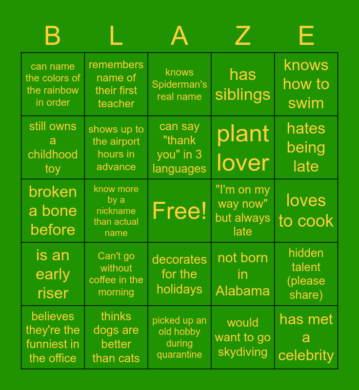 This bingo card has a free space and 24 words: Can't go without coffee in the morning, thinks dogs are better than cats, can say "thank you" in 3 languages, believes they're the funniest in the office, knows how to swim, can name the colors of the rainbow in order, still owns a childhood toy, remembers name of their first teacher, "I'm on my way now" but always late, decorates for the holidays, plant lover, broken a bone before, not born in Alabama, hidden talent (please share), shows up to the airport hours in advance, would want to go skydiving, loves to cook, knows Spiderman's real name, hates being late, know more by a nickname than actual name, has met a celebrity, is an early riser, has siblings and picked up an old hobby during quarantine.