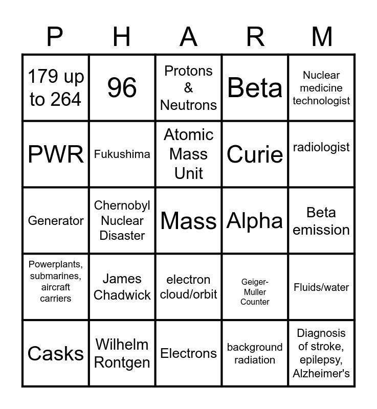 This bingo card has 8 images and 77 words: Uranium, Protons & Neutrons, Inhalation, injection, orally, Nuclear change, Enrico Fermi, Nucleus, Iodine 123/131 (I123/I131), Steam, Ernest Rutherford, electron cloud/orbit, Curie, Technetium 99 (Tc 99), 179 up to 264, Chernobyl Nuclear Disaster, Mass, mrem, Diagnosis of stroke, epilepsy, Alzheimer's, 121 up to 193, Fukushima, Electrons, Becquerel, radiologist, Control rods, Three Mile Island, Fission, Nausea, headache, vomiting, Casks, Robert Oppenheimer, Fusion, Beta, Beta emission, Truck and train, Wilhelm Rontgen, Alpha, Nuclear medicine technologist, Meltdown, "The China Syndrome", Nuclei of radioactive atoms, increase, Fluids/water, 40 years, The Manhattan Project, Protons, neutrons, electrons, decrease, Gamma or scintillation camera, PWR, 96, The element, lead or concrete, Positron Emission Tomography, BWR, James Chadwick, Atomic Mass Unit, background radiation, Dental, Turbine, Obninsk, Energy levels, ALARA, Person-rem/ Person-Sv, Generator, Boron I, decay, Radioisotope/ radionuclide, Brain, spinal cord, soft tissue, Callaway, Kashiwazaki- Kariwa, 3, NRC, Nuclear reactor, Half- life, Water or plastic, CT/CAT, Powerplants, submarines, aircraft carriers, Uranium, Geiger- Muller Counter and Nuclear Medicine Technologist.