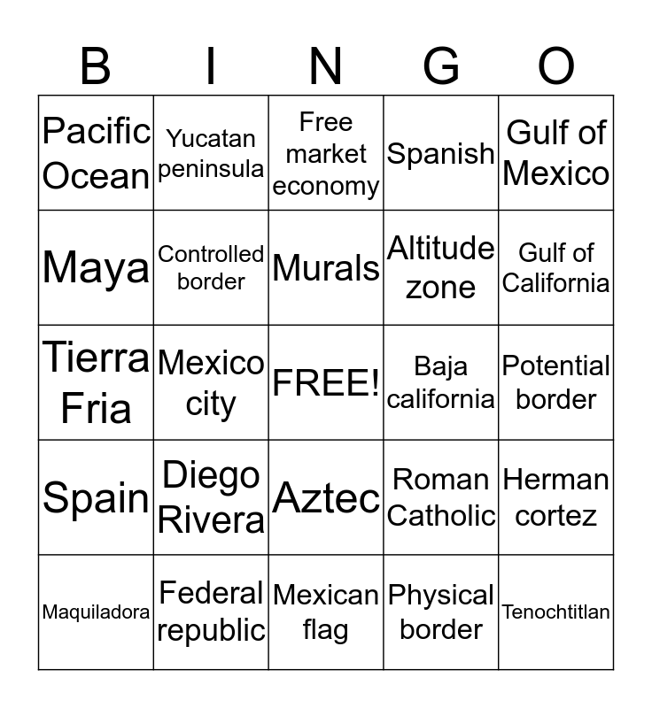 This bingo card has a free space and 24 words: Diego Rivera, Federal republic, Murals, Maquiladora, Gulf of Mexico, Pacific Ocean, Maya, Yucatan peninsula, Baja california, Aztec, Altitude zone, Tierra Fria, Roman Catholic, Herman cortez, Controlled border, Physical border, Potential border, Free market economy, Gulf of California, Mexico city, Tenochtitlan, Spain, Spanish and Mexican flag.