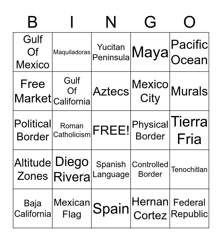 This bingo card has a free space and 24 words: Diego Rivera, Mexican Flag, Aztecs, Baja California, Pacific Ocean, Gulf Of Mexico, Free Market, Maquiladoras, Physical Border, Spanish Language, Mexico City, Political Border, Controlled Border, Tenochitlan, Gulf Of California, Hernan Cortez, Tierra Fria, Yucitan Peninsula, Murals, Roman Catholicism, Federal Republic, Altitude Zones, Maya and Spain.