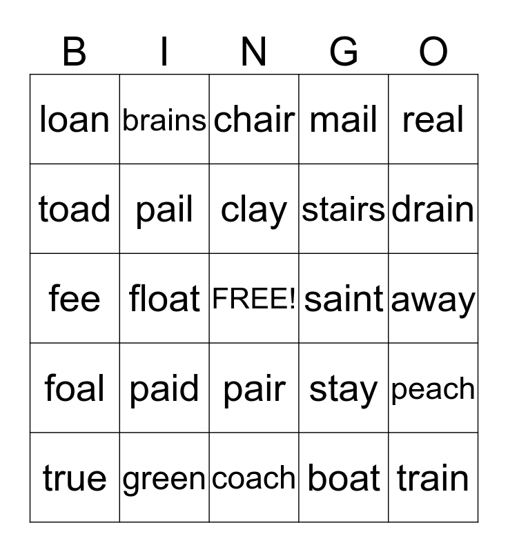 This bingo card has a free space and 24 words: paid, green, clay, true, real, loan, toad, brains, saint, pair, stairs, fee, stay, peach, pail, boat, away, chair, drain, float, train, foal, mail and coach.