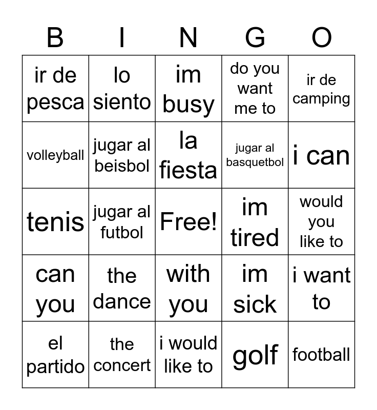 This bingo card has a free space and 24 words: the dance, the concert, la fiesta, el partido, ir de camping, ir de pesca, volleyball, lo siento, im tired, with you, jugar al basquetbol, tenis, im sick, i want to, jugar al beisbol, golf, would you like to, im busy, i can, jugar al futbol, football, can you, do you want me to and i would like to.