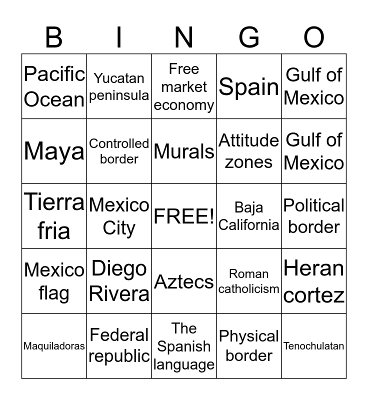 This bingo card has a free space and 24 words: Diego Rivera, Federal republic, Murals, Maquiladoras, Gulf of Mexico, Pacific Ocean, Maya, Yucatan peninsula, Baja California, Aztecs, Attitude zones, Tierra fria, Roman catholicism, Heran cortez, Controlled border, Physical border, Political border, Free market economy, Gulf of Mexico, Mexico City, Tenochulatan, Mexico flag, Spain and The Spanish language.