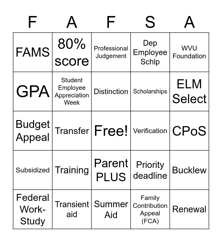 This bingo card has a free space and 52 words: Compliance, Training, PCI, GLBA, CPoS, Quiz, 80% score, One Pager, Scholarships, Renewal, GPA, Requirements, Go First, Bucklew, Diversity, Leadership, Distinction, Priority deadline, Eligibility, FAMS, Transfer, PROMISE, Dep Employee Schlp, WVU Foundation, Processing, Satisfactory Academic Progress (SAP), WVU Med Tuition Benefit, Campus Logic, ELM Select, Subsidized, Unsubsidized, Professional Judgement, Pell, FSEOG, Federal Work-Study, Student Employee Appreciation Week, Parent PLUS, WV Higher Ed Grant, FAA Access, NSLDS, COD, Summer Aid, Family Contribution Appeal (FCA), Cost of Attendance, Budget Appeal, TEACH Grant, EFC, Verification, Degree Pursuant, Over award, Transient aid and Loan adjustments.