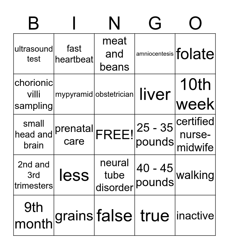 This bingo card has a free space and 27 words: 40 - 45 pounds, tetracycline, liver, false, chorionic villi sampling, meat and beans, fast heartbeat, 2nd and 3rd trimesters, 25 - 35 pounds, walking, small head and brain, amniocentesis, 9th month, grains, 10th week, 1st and 3rd trimesters, mypyramid, obstetrician, less, ultrasound test, certified nurse-midwife, true, prenatal care, inactive, neural tube disorder, folate and anemia.