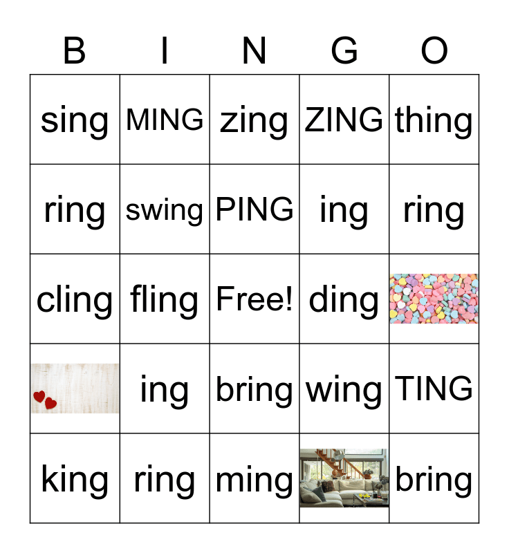 This bingo card has 3 images, a free space and 26 words: king, thing, fling, wing, sing, zing, swing, ing, ding, ring, bring, ming, ring, cling, bring, thing, cling, wing, sing, ing, ring, ZING, MING, TING, PING and CLING.