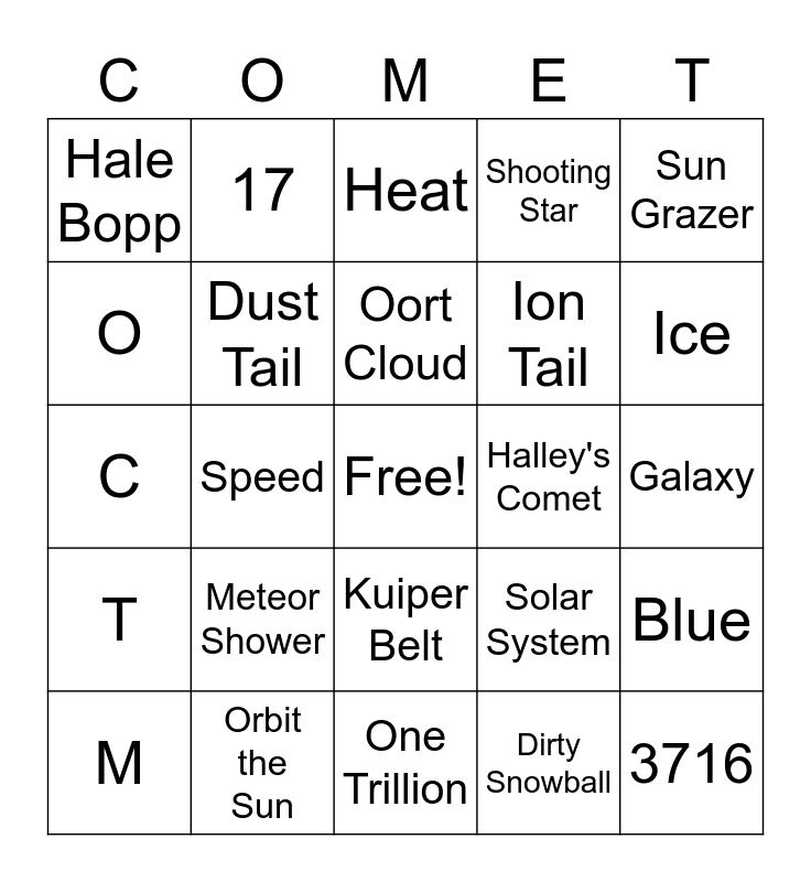 This bingo card has a free space and 28 words: Blue, Astronomer, Ion Tail, Dirty Snowball, O, Heat, 17, T, Halley's Comet, M, C, Shooting Star, Orbit the Sun, One Trillion, Ice, Nucleus, Meteor Shower, Dust Tail, Oort Cloud, Kuiper Belt, Hale Bopp, E, 3716, Speed, Galaxy, Solar System, Sun Grazer and Space.