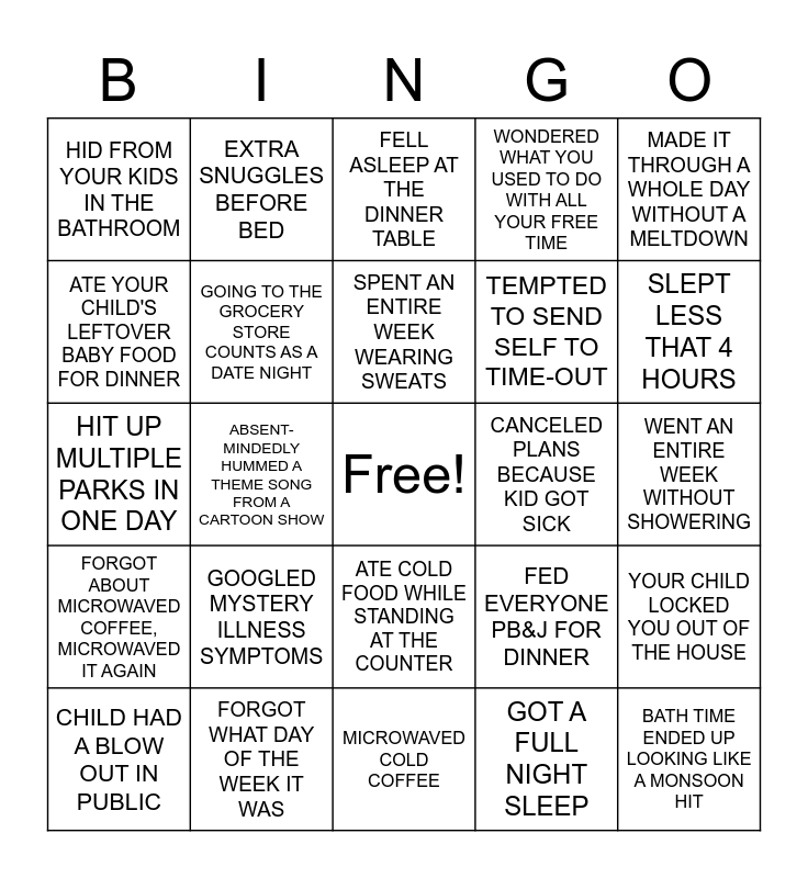 This bingo card has a free space and 24 words: CHILD HAD A BLOW OUT IN PUBLIC, GOOGLED MYSTERY ILLNESS SYMPTOMS, SPENT AN ENTIRE WEEK WEARING SWEATS, GOT A FULL NIGHT SLEEP, MADE IT THROUGH A WHOLE DAY WITHOUT A MELTDOWN, HID FROM YOUR KIDS IN THE BATHROOM, EXTRA SNUGGLES BEFORE BED, FELL ASLEEP AT THE DINNER TABLE, CANCELED PLANS BECAUSE KID GOT SICK, WENT AN ENTIRE WEEK WITHOUT SHOWERING, HIT UP MULTIPLE PARKS IN ONE DAY, GOING TO THE GROCERY STORE COUNTS AS A DATE NIGHT, FED EVERYONE PB&J FOR DINNER, YOUR CHILD LOCKED YOU OUT OF THE HOUSE, ATE YOUR CHILD'S LEFTOVER BABY FOOD FOR DINNER, FORGOT WHAT DAY OF THE WEEK IT WAS, MICROWAVED COLD COFFEE, WONDERED WHAT YOU USED TO DO WITH ALL YOUR FREE TIME, SLEPT LESS THAT 4 HOURS, FORGOT ABOUT MICROWAVED COFFEE, MICROWAVED IT AGAIN, ABSENT-MINDEDLY HUMMED A THEME SONG FROM A CARTOON SHOW, ATE COLD FOOD WHILE STANDING AT THE COUNTER, TEMPTED TO SEND SELF TO TIME-OUT and BATH TIME ENDED UP LOOKING LIKE A MONSOON HIT.