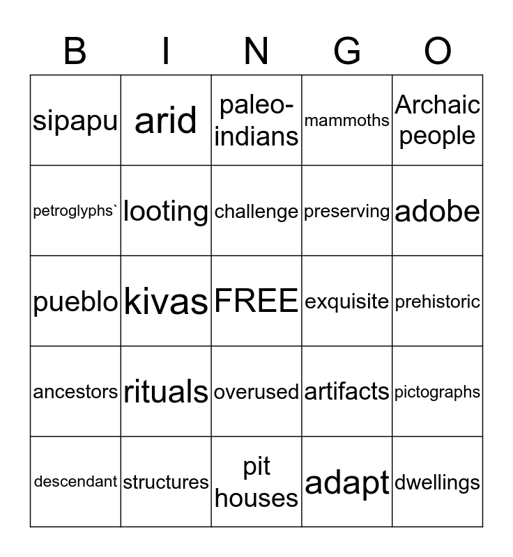 This bingo card has a free space and 24 words: rituals, structures, challenge, descendant, Archaic people, sipapu, petroglyphs`, arid, exquisite, overused, preserving, pueblo, artifacts, pictographs, looting, adapt, prehistoric, paleo- indians, adobe, kivas, dwellings, ancestors, mammoths and pit houses.