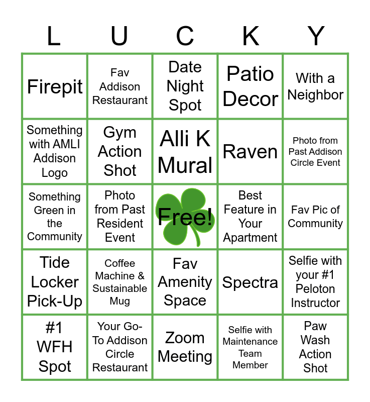 This bingo card has a free space and 24 words: Coffee Machine & Sustainable Mug, Your Go-To Addison Circle Restaurant, Alli K Mural, #1 WFH Spot, With a Neighbor, Firepit, Something with AMLI Addison Logo, Fav Addison Restaurant, Best Feature in Your Apartment, Fav Amenity Space, Raven, Something Green in the Community, Spectra, Selfie with your #1 Peloton Instructor, Gym Action Shot, Selfie with Maintenance Team Member, Fav Pic of Community, Date Night Spot, Photo from Past Addison Circle Event, Photo from Past Resident Event, Paw Wash Action Shot, Tide Locker Pick-Up, Patio Decor and Zoom Meeting.