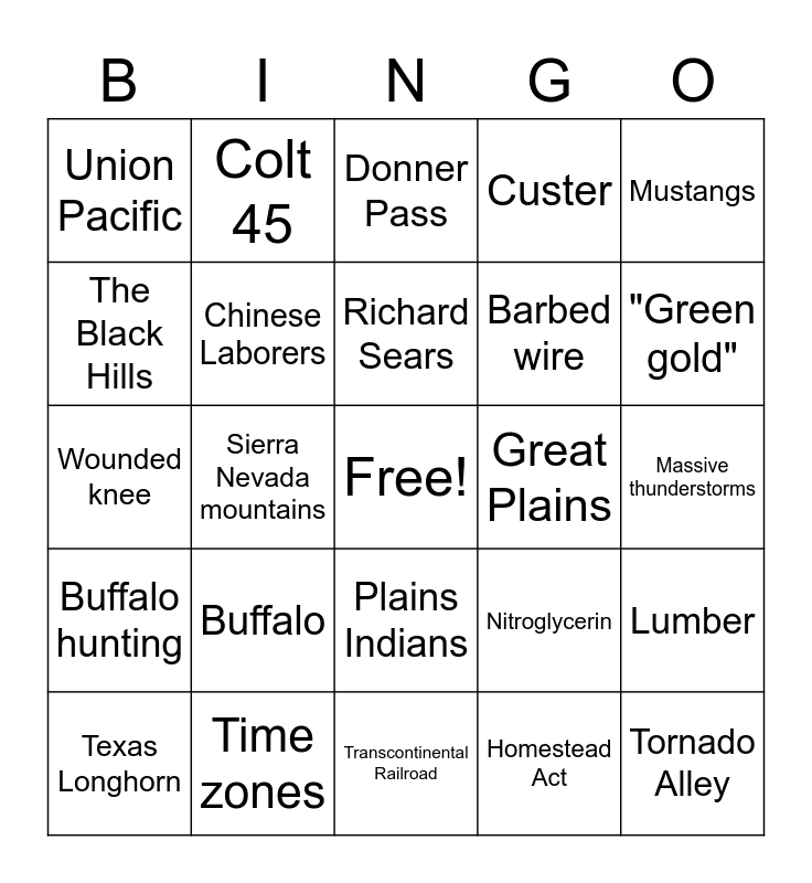 This bingo card has a free space and 31 words: Transcontinental Railroad, Irish immigrants, Sierra Nevada mountains, Theodore Judah, Union Pacific, Donner Pass, Chinese Laborers, Nitroglycerin, Great Plains, Homestead Act, Massive thunderstorms, Tornado Alley, Locusts, "Bread basket of the country", "Green gold", Log jams, Lumber, Buffalo, Buffalo hunting, Plains Indians, Mustangs, Cowboys, Texas Longhorn, Colt 45, Barbed wire, The Black Hills, Custer, Wounded knee, Time zones, Richard Sears and 30% of the world's goods.