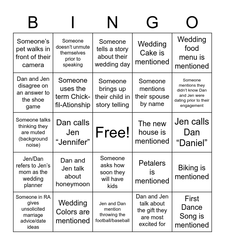 This bingo card has a free space and 24 words: Dan and Jen talk about honeymoon, Wedding Colors are mentioned, Someone brings up their child in story telling, Someone in RA gives unsolicited marriage advice/date ideas, Wedding food menu is mentioned, Someone’s pet walks in front of their camera, Dan and Jen disagree on an answer to the shoe game, Someone doesn’t unmute themselves prior to speaking, The new house is mentioned, Someone asks how soon they will have kids, Someone mentions their spouse by name, Someone talks thinking they are muted (background noise), Petalers is mentioned, Biking is mentioned, Someone uses the term Chick-fil-Ationship, Dan and Jen talk about the gift they are most excited for, Jen calls Dan “Daniel”, Someone tells a story about their wedding day, Someone mentions they didn’t know Dan and Jen were dating prior to their engagement, Dan calls Jen “Jennifer”, First Dance Song is mentioned, Jen/Dan refers to Jen’s mom as the wedding planner, Wedding Cake is mentioned and Jen and Dan mention throwing the football/baseball.