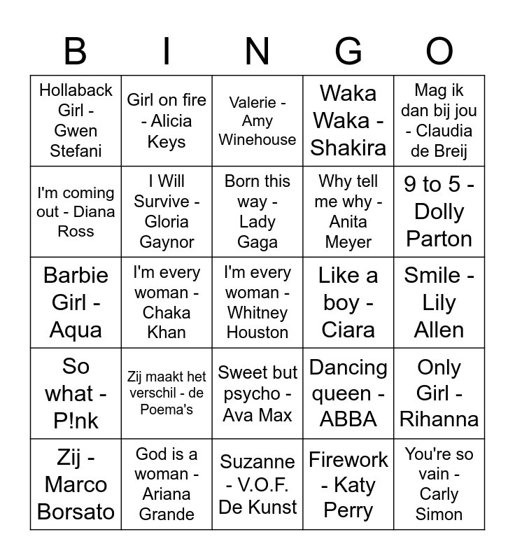 This bingo card has 92 words: Free!, Girls just want to have fun - Cyndi Lauper, Suzanne - V.O.F. De Kunst, Superwoman - Alicia Keys, Jolene - Dolly Parton, Girl - Anouk, She's a Liar - Dolly Dots, Zij - Marco Borsato, Ain't your mama - Jennifer Lopez, Alle kleuren - K3, Pamela - TOTO, Survivor - Destiny's Child, When the lady smiles - Golden Earring, Why tell me why - Anita Meyer, What's a girl to do - Fatima Yamaha, Mag ik dan bij jou - Claudia de Breij, Valerie - Amy Winehouse, Woman - Anouk, Working girl - Dolly Parton, Laura - Jan Smit, Respect - Aretha Franklin, Fire - The Pointer Sisters, Run the world (Girls) - Beyonce, J'aime la vie - Sandra Kim, Zij maakt het verschil - de Poema's, I Will Survive - Gloria Gaynor, Woman like me - Little Mix, Nicki Minaj, You're so vain - Carly Simon, Believe - Cher, Scars to your beautiful - Alessia cara, God is a woman - Ariana Grande, Sweet but psycho - Ava Max, Roar - Katy Perry, The Man - Taylor Swift, Girl on fire - Alicia Keys, Single ladies - Beyonce, Stronger - Kelly Clarkson, Royals - Lorde, Born this way - Lady Gaga, Dancing queen - ABBA, Barbie Girl - Aqua, So what - P!nk, Smile - Lily Allen, Only girl (In the world) - Rihanna, I'm every woman - Whitney Houston, Viva Forever - Spice Girls, Independent women - Destiny's Child, Material girl - Madonna, Man! I feel like a woman - Shania Twain, Beautiful - Christina Aguilera, Like a girl - Lizzo, Don't call me up - Mabel, No Scrubs - TLC, Miss independent - Ne-Yo, Stronger - Britney Spears, Just a Girl - No Doubt, You oughta know - Alanis Morissette, I'm coming out - Diana Ross, Uptown girl - Billy Joel, I'm every woman - Chaka Khan, Sisters are doin't it for themselves - Aretha Franklin, Helene - Julien Clerc, Rolling in the deep - Adele, Shake it off - Taylor Swift, Call me maybe - Carly Rae Jepsen, Firework - Katy Perry, What's up - 4 Non Blondes, Wannabe - Spice Girls, Sexy als ik dans - Nielson, Duurt te lang - Davina Michelle, Back it up - Caro Emerald, Emotions - Mariah Carey, Waka Waka - Shakira, Believe - Cher, I'm alive - Celine Dion, Titanium - David Guetta ft. Sia, Only Girl - Rihanna, Stronger (what doesn't kill you) - Kelly Clarkson, Girl on fire - Alicia Keys, Love Myself - Hailee Steinfeld, Hey Soul Sister - Train, Like a boy - Ciara, Hollaback Girl - Gwen Stefani, Rosanne - Nick & Simon, Who's that lady with my man - Patricia Paay, Two can have a party - Tammi Terrell, You're so vain - Carly Simon, Hung up - Madonna, Just Dance - Lady Gaga, 99 Luftballons - Nena, 9 to 5 - Dolly Parton and Let's get loud - Jennifer Lopez.