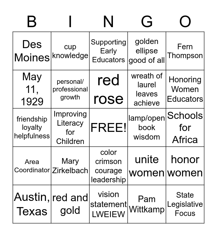 This bingo card has a free space and 24 words: Mary Zirkelbach, red and gold, red rose, Austin, Texas, Fern Thompson, Des Moines, May 11, 1929, cup knowledge, lamp/open book wisdom, color crimson courage leadership, wreath of laurel leaves achieve, friendship loyalty helpfulness, unite women, honor women, personal/ professional growth, Pam Wittkamp, Schools for Africa, Supporting Early Educators, Honoring Women Educators, Improving Literacy for Children, State Legislative Focus, Area Coordinator, golden ellipse good of all and vision statement LWEIEW.