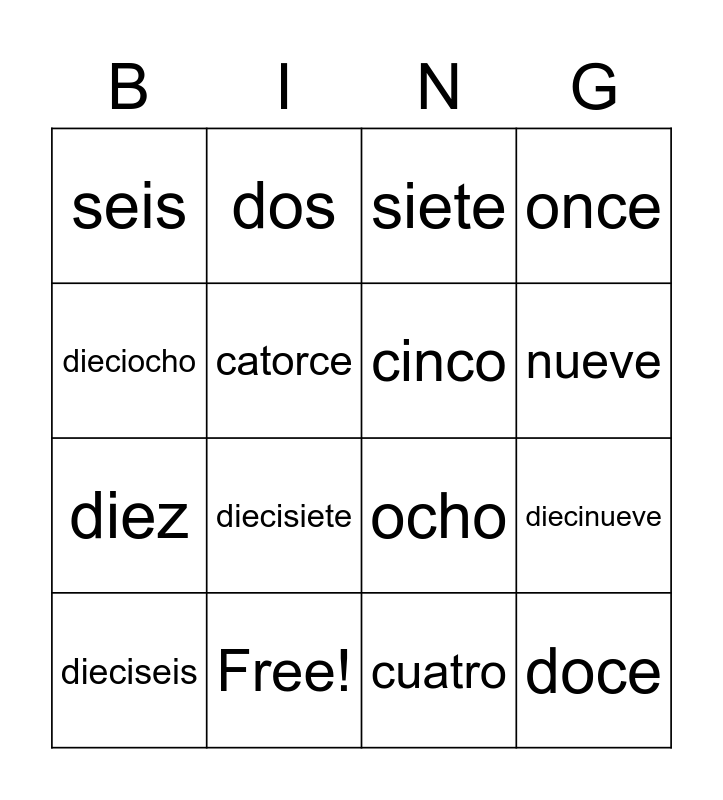 This bingo card has 21 words: Free!, uno, dos, tres, cuatro, cinco, seis, siete, ocho, nueve, diez, once, doce, trece, catorce, quince, dieciseis, diecisiete, dieciocho, diecinueve and veinte.
