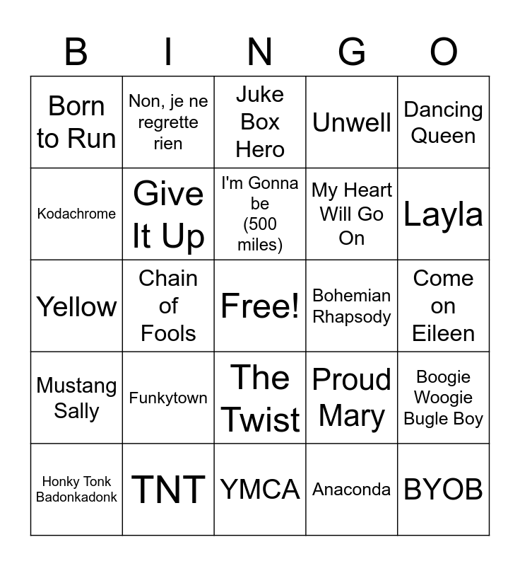This bingo card has a free space and 35 words: Jump Around, Man, I feel like a woman, Hips Don't Lie, Give It Up, The Twist, Unwell, Kodachrome, Jolene, I'm Gonna be (500 miles), Return of the Mack, Yellow, Dancing Queen, Spiderwebs, You Dropped A Bomb, Born to Run, Bohemian Rhapsody, Anaconda, Chain of Fools, Mustang Sally, BYOB, Proud Mary, Honky Tonk Badonkadonk, Boogie Woogie Bugle Boy, TNT, Juke Box Hero, Layla, Wicked Game, Dude Looks Like a Lady, My Heart Will Go On, Come on Eileen, Welcome to the Jungle, YMCA, Funkytown, Non, je ne regrette rien and Simply Irresistable.