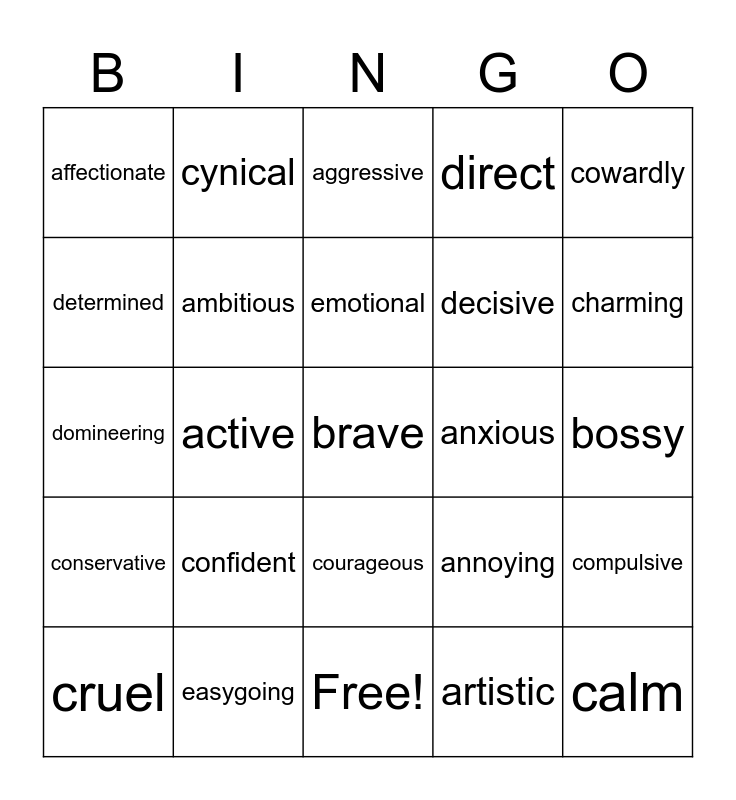 This bingo card has 31 words: Free!, abusive, active, adventurous, affectionate, aggressive, ambitious, annoying, anxious, artistic, bossy, brave, calm, cautious, charming, cheerful, compulsive, confident, conservative, courageous, cowardly, creative, cruel, cynical, decisive, determined, direct, domineering, easygoing, emotional and enthusiastic.