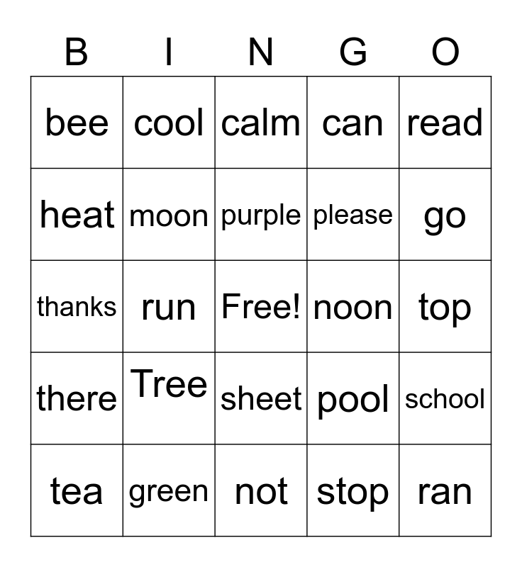 This bingo card has a free space and 24 words: Tree, green, purple, tea, read, bee, heat, cool, noon, sheet, please, thanks, pool, school, moon, stop, top, calm, go, run, ran, there, can and not.
