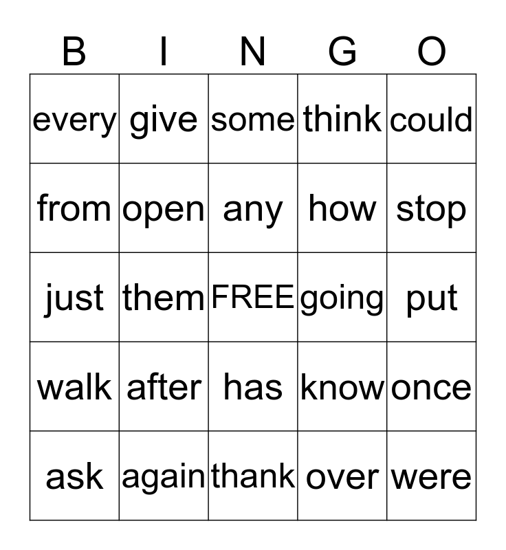 This bingo card has a free space and 24 words: after, again, any, ask, could, every, from, give, going, has, how, just, know, once, open, over, put, some, stop, them, were, walk, think and thank.