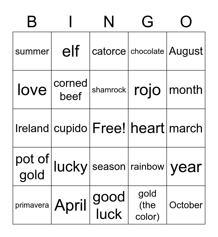 This bingo card has a free space and 24 words: lucky, April, shamrock, primavera, August, summer, love, elf, heart, season, rojo, Ireland, rainbow, year, corned beef, gold (the color), march, catorce, month, cupido, October, pot of gold, chocolate and good luck.