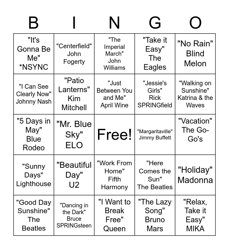 This bingo card has a free space and 24 words: "Good Day Sunshine" The Beatles, "Beautiful Day" U2, "Just Between You and Me" April Wine, "The Lazy Song" Bruno Mars, "No Rain" Blind Melon, "It's Gonna Be Me" *NSYNC, "Centerfield" John Fogerty, "The Imperial March" John Williams, "Margaritaville" Jimmy Buffett, "Vacation" The Go-Go's, "5 Days in May" Blue Rodeo, "Patio Lanterns" Kim Mitchell, "Here Comes the Sun" The Beatles, "Holiday" Madonna, "I Can See Clearly Now" Johnny Nash, "Dancing in the Dark" Bruce SPRINGsteen, "I Want to Break Free" Queen, "Take it Easy" The Eagles, "Walking on Sunshine" Katrina & the Waves, "Sunny Days" Lighthouse, "Mr. Blue Sky" ELO, "Work From Home" Fifth Harmony, "Jessie's Girls" Rick SPRINGfield and "Relax, Take it Easy" MIKA.