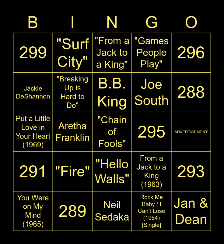 This bingo card has 55 words: We Five, You Were on My Mind (1965), "You Were on My Mind", 299, Neil Sedaka, Breaking Up Is Hard to Do / As Long as I Live (1962) [Single], "Breaking Up is Hard to Do", 298, Joe South, Introspect (1968), "Games People Play", 297, Free!, Neil Diamond, Just for You (1967), "Thank Lord for the Nighttime", 296, Aretha Franklin, Lady Soul (1968), "Chain of Fools", 295, Ned Miller, From a Jack to a King (1963), "From a Jack to a King", 294, B.B. King, Rock Me Baby / I Can't Lose (1964) [Single], "Rock Me Baby", ADVERTISEMENT, 293, Bo Diddley, Bo Diddley in the Spotlight (1960), "Road Runner", 292, Jackie DeShannon, Put a Little Love in Your Heart (1969), "Put a Little Love in Your Heart", 291, Jan & Dean, Surf City / She's My Summer Girl (1963) [Single], "Surf City", 290, The Crazy World of Arthur Brown, The Crazy World of Arthur Brown (1968), "Fire", 289, The Chambers Brothers, The Time Has Come (1967), "Time Has Come Today", 288, Ray Charles, Unchain My Heart / But on the Other Hand Baby (1961) [Single], "Unchain My Heart, "Hello Walls" and On My Way B. J. Thomas.