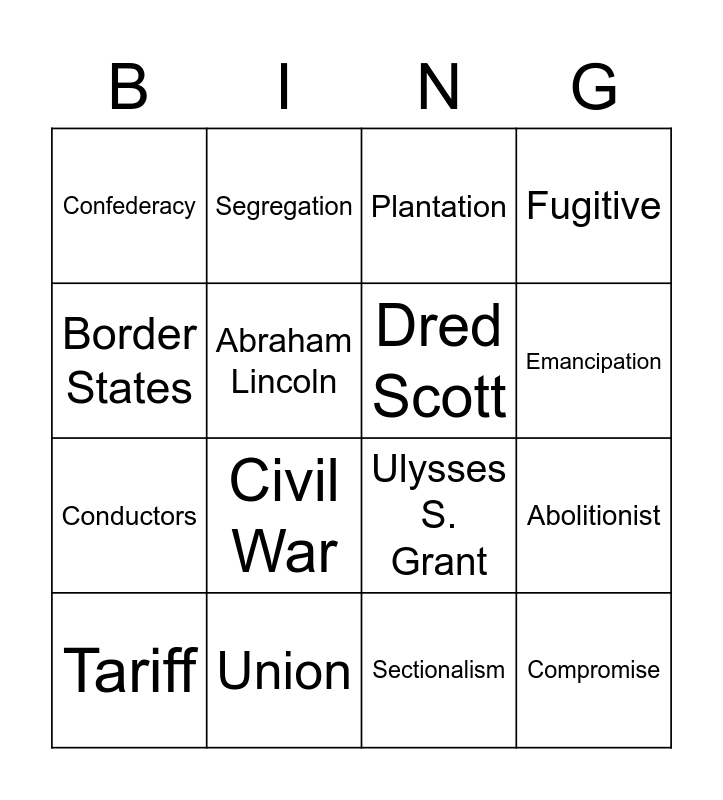 This bingo card has 20 words: Abolitionist, Underground Railroad, Plantation, Robert E. Lee, Tariff, Border States, Union, Confederacy, Conductors, Segregation, Civil War, Ulysses S. Grant, Abraham Lincoln, Compromise, Dred Scott, Secede, Emancipation, Fugitive, Sectionalism and Harriet Tubman.