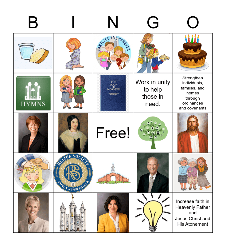 This bingo card has 21 images, a free space and 3 words: Work in unity to help those in need., Strengthen individuals, families, and homes through ordinances and covenants and Increase faith in Heavenly Father and Jesus Christ and His Atonement.