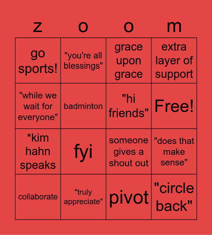 This bingo card has 18 words: fyi, "circle back", grace upon grace, go sports!, someone gives a shout out, extra layer of support, collaborate, "you're all blessings", Free!, *kim hahn speaks, pivot, "while we wait for everyone", "does that make sense", badminton, "hi friends", *joe list speaks, "truly appreciate" and someone asks about the AD position.