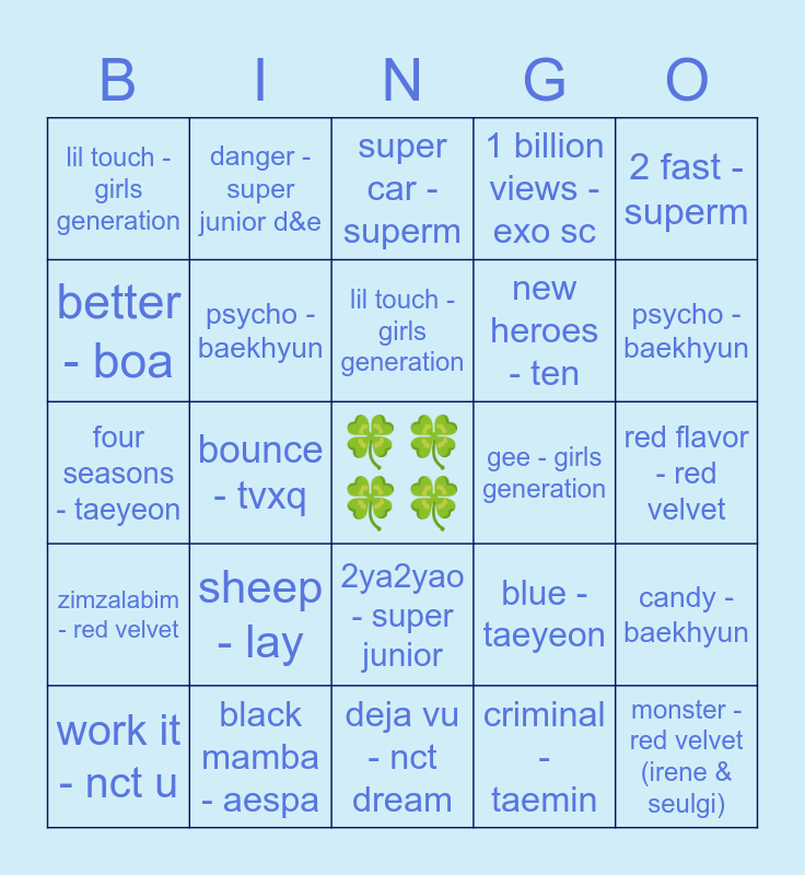 ⚠ This card has duplicate items: monster - exo (2), tempo - exo (2), love shot - exo (2), what a life - exo sc (2), 1 billion views - exo sc (2), blooming day - exo cbx (2), sheep - lay (2), psycho - baekhyun (2), candy - baekhyun (2), mmmh - kai (2), beautiful goodbye - chen (2), let’s love - suho (2), i got a boy - girls generation (2), gee - girls generation (2), lil touch - girls generation (2), blue - taeyeon (2), four seasons - taeyeon (2), lonely - jonghyun ft taeyeon (2), dessert - hyo (2), sober - hyo (2), electric shock - f(x) (2), 4 walls - f(x) (2), butterfly - boa (2), better - boa (2)
