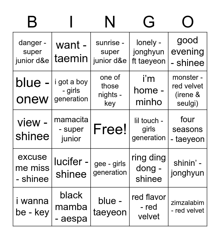 This bingo card has a free space and 30 words: black mamba - aespa, 2ya2yao - super junior, mamacita - super junior, super clap - super junior, danger - super junior d&e, sunrise - super junior d&e, i got a boy - girls generation, gee - girls generation, lil touch - girls generation, blue - taeyeon, four seasons - taeyeon, zimzalabim - red velvet, red flavor - red velvet, russian roulette - red velvet, monster - red velvet (irene & seulgi), naughty - red velvet (irene & seulgi), ring ding dong - shinee, excuse me miss - shinee, lucifer - shinee, good evening - shinee, view - shinee, criminal - taemin, want - taemin, i’m home - minho, blue - onew, lonely - jonghyun ft taeyeon, shinin’ - jonghyun, i wanna be - key, one of those nights - key and mirotic - tvxq.