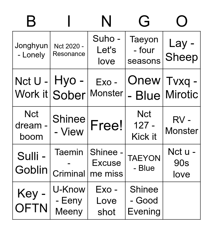 This bingo card has a free space and 24 words: Sulli - Goblin, U-Know - Eeny Meeny, Shinee - Excuse me miss, TAEYON - Blue, Lay - Sheep, Jonghyun - Lonely, Nct 2020 - Resonance, Suho - Let's love, Onew - Blue, Nct u - 90s love, Nct U - Work it, Hyo - Sober, Superm - 2 fast, Nct 127 - Kick it, Tvxq - Mirotic, Key - OFTN, Shinee - View, Exo - Monster, Taeyon - four seasons, RV - Monster, Nct dream - boom, Taemin - Criminal, Exo - Love shot and Shinee - Good Evening.