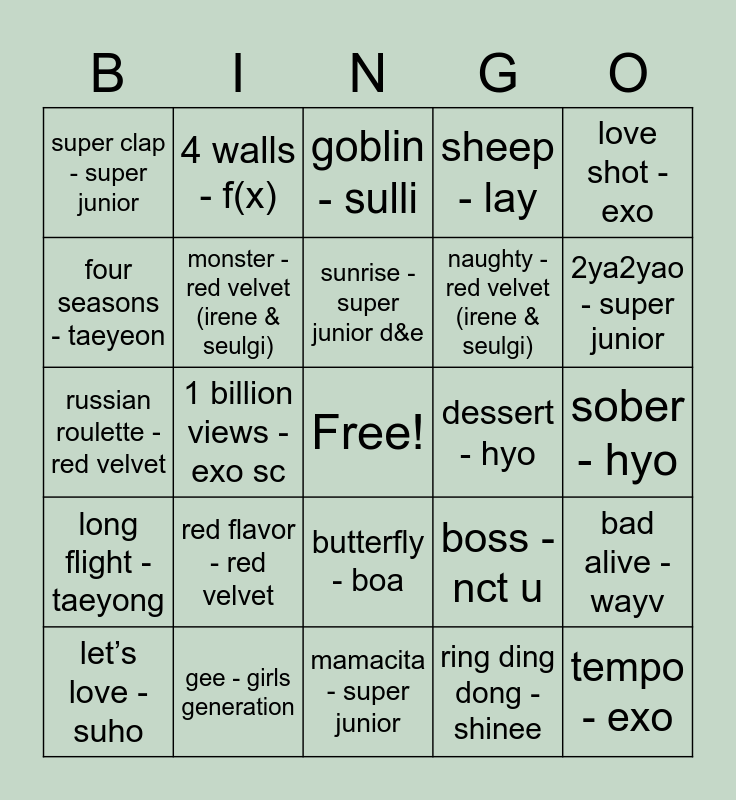 This bingo card has a free space and 24 words: red flavor - red velvet, gee - girls generation, sunrise - super junior d&e, let’s love - suho, love shot - exo, super clap - super junior, four seasons - taeyeon, 4 walls - f(x), dessert - hyo, butterfly - boa, naughty - red velvet (irene & seulgi), russian roulette - red velvet, boss - nct u, bad alive - wayv, monster - red velvet (irene & seulgi), ring ding dong - shinee, sober - hyo, goblin - sulli, 2ya2yao - super junior, 1 billion views - exo sc, tempo - exo, long flight - taeyong, sheep - lay and mamacita - super junior.