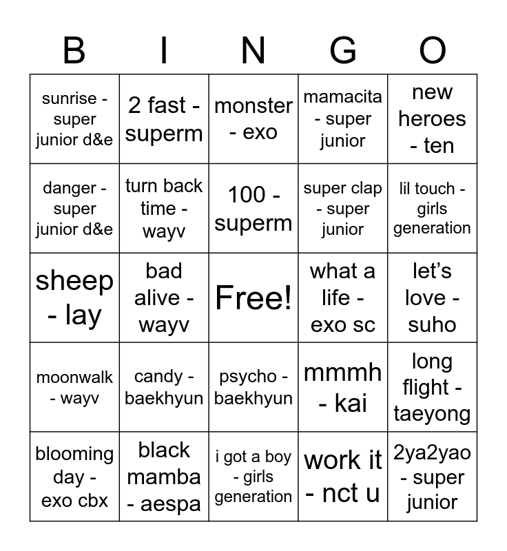 This bingo card has a free space and 32 words: work it - nct u, 90’s love - nct u, bad alive - wayv, kick back - wayv, moonwalk - wayv, turn back time - wayv, new heroes - ten, long flight - taeyong, 2 fast - superm, super car - superm, 100 - superm, monster - exo, tempo - exo, love shot - exo, what a life - exo sc, 1 billion views - exo sc, blooming day - exo cbx, sheep - lay, psycho - baekhyun, candy - baekhyun, mmmh - kai, beautiful goodbye - chen, let’s love - suho, black mamba - aespa, 2ya2yao - super junior, mamacita - super junior, super clap - super junior, danger - super junior d&e, sunrise - super junior d&e, i got a boy - girls generation, gee - girls generation and lil touch - girls generation.