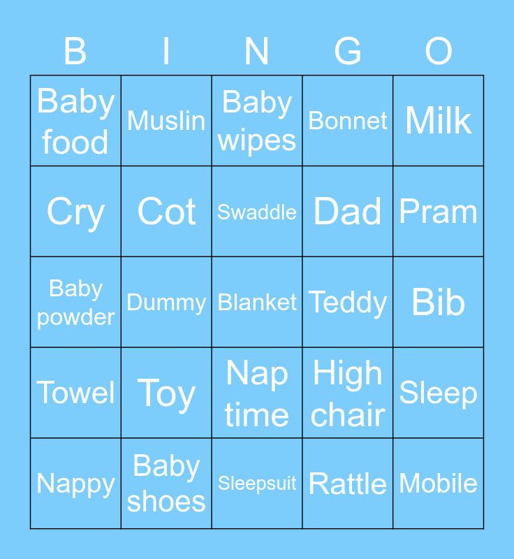 This bingo card has a free space and 29 words: Nappy, Bottle, Dummy, Crib, Baby food, Baby wipes, Cot, Toy, Teddy, Baby shoes, Bib, Mobile, Sleepsuit, Rattle, Pram, Mum, Nap time, Towel, Milk, Baby powder, High chair, Sick, Dad, Cry, Bonnet, Muslin, Sleep, Swaddle and Tantrum.