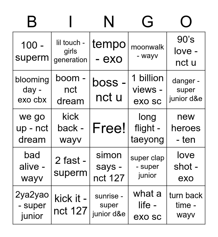 This bingo card has a free space and 40 words: resonance - nct 2020, we go up - nct dream, deja vu - nct dream, boom - nct dream, kick it - nct 127, simon says - nct 127, boss - nct u, work it - nct u, 90’s love - nct u, bad alive - wayv, kick back - wayv, moonwalk - wayv, turn back time - wayv, new heroes - ten, long flight - taeyong, 2 fast - superm, super car - superm, 100 - superm, monster - exo, tempo - exo, love shot - exo, what a life - exo sc, 1 billion views - exo sc, blooming day - exo cbx, sheep - lay, psycho - baekhyun, candy - baekhyun, mmmh - kai, beautiful goodbye - chen, let’s love - suho, black mamba - aespa, 2ya2yao - super junior, mamacita - super junior, super clap - super junior, danger - super junior d&e, sunrise - super junior d&e, i got a boy - girls generation, gee - girls generation, lil touch - girls generation and blue - taeyeon.