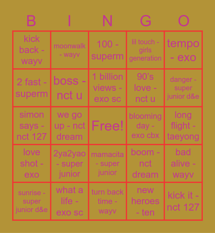 This bingo card has a free space and 40 words: resonance - nct 2020, we go up - nct dream, deja vu - nct dream, boom - nct dream, kick it - nct 127, simon says - nct 127, boss - nct u, work it - nct u, 90’s love - nct u, bad alive - wayv, kick back - wayv, moonwalk - wayv, turn back time - wayv, new heroes - ten, long flight - taeyong, 2 fast - superm, super car - superm, 100 - superm, monster - exo, tempo - exo, love shot - exo, what a life - exo sc, 1 billion views - exo sc, blooming day - exo cbx, sheep - lay, psycho - baekhyun, candy - baekhyun, mmmh - kai, beautiful goodbye - chen, let’s love - suho, black mamba - aespa, 2ya2yao - super junior, mamacita - super junior, super clap - super junior, danger - super junior d&e, sunrise - super junior d&e, i got a boy - girls generation, gee - girls generation, lil touch - girls generation and blue - taeyeon.