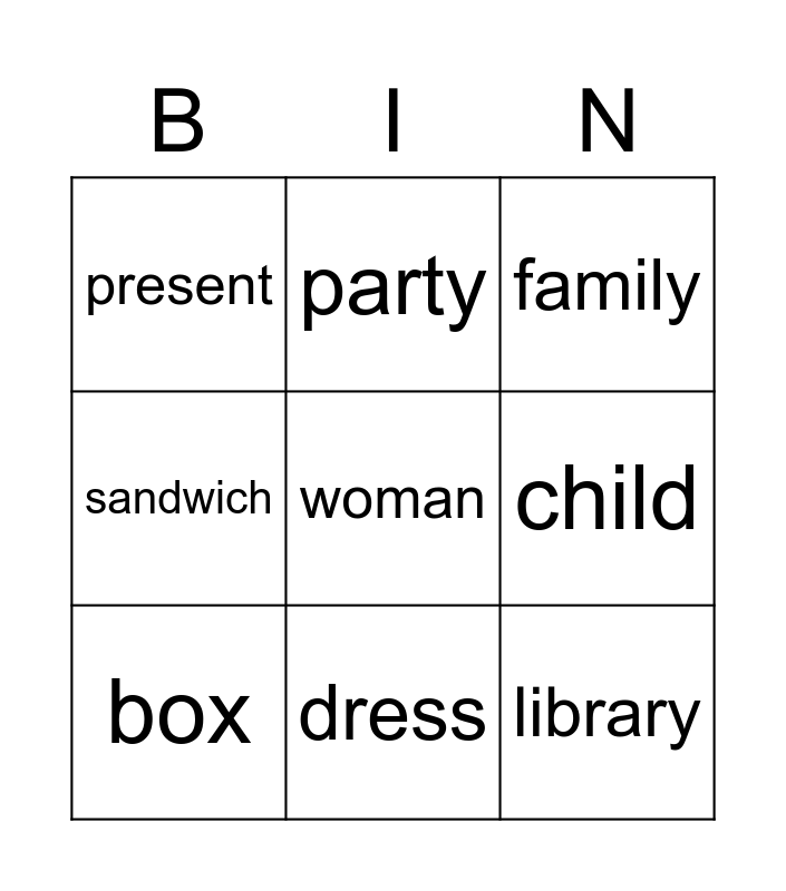 This bingo card has 21 words: baby, Free!, party, brush, flower, box, present, family, house, dress, library, sandwich, baby, picture, child, food, mouse, man, woman, fish and sheep.