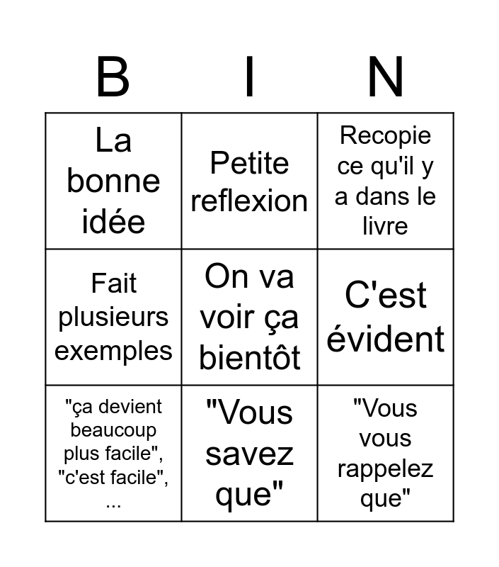 This bingo card has 9 words: "ça devient beaucoup plus facile", "c'est facile", ..., Recopie ce qu'il y a dans le livre, Petite reflexion, Fait plusieurs exemples, La bonne idée, C'est évident, On va voir ça bientôt, "Vous vous rappelez que" and "Vous savez que".