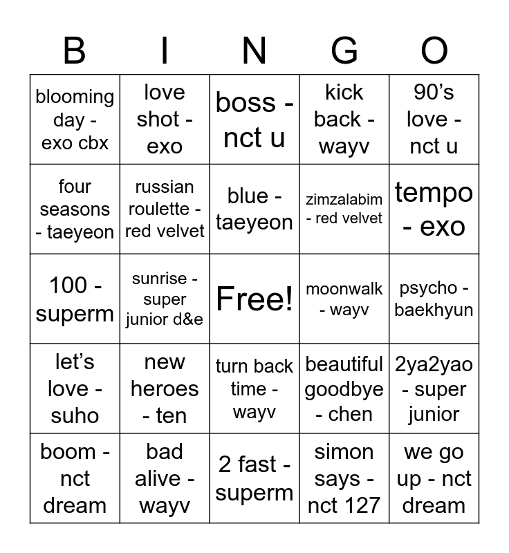 This bingo card has a free space and 45 words: resonance - nct 2020, we go up - nct dream, deja vu - nct dream, boom - nct dream, kick it - nct 127, simon says - nct 127, boss - nct u, work it - nct u, 90’s love - nct u, bad alive - wayv, kick back - wayv, moonwalk - wayv, turn back time - wayv, new heroes - ten, long flight - taeyong, 2 fast - superm, super car - superm, 100 - superm, monster - exo, tempo - exo, love shot - exo, what a life - exo sc, 1 billion views - exo sc, blooming day - exo cbx, sheep - lay, psycho - baekhyun, candy - baekhyun, mmmh - kai, beautiful goodbye - chen, let’s love - suho, black mamba - aespa, 2ya2yao - super junior, mamacita - super junior, super clap - super junior, danger - super junior d&e, sunrise - super junior d&e, i got a boy - girls generation, gee - girls generation, lil touch - girls generation, blue - taeyeon, four seasons - taeyeon, zimzalabim - red velvet, red flavor - red velvet, russian roulette - red velvet and monster - red velvet (irene & seulgi).