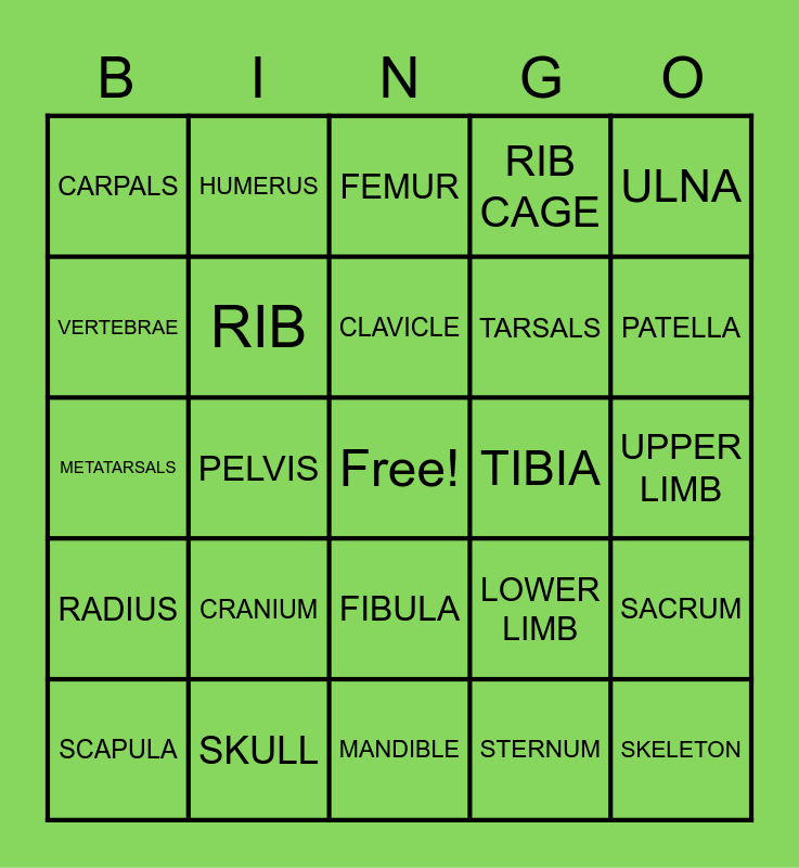This bingo card has a free space and 24 words: CRANIUM, SKULL, CLAVICLE, SCAPULA, ULNA, CARPALS, VERTEBRAE, HUMERUS, TIBIA, FIBULA, TARSALS, METATARSALS, LOWER LIMB, SACRUM, RIB, STERNUM, UPPER LIMB, FEMUR, PATELLA, PELVIS, SKELETON, RADIUS, RIB CAGE and MANDIBLE.