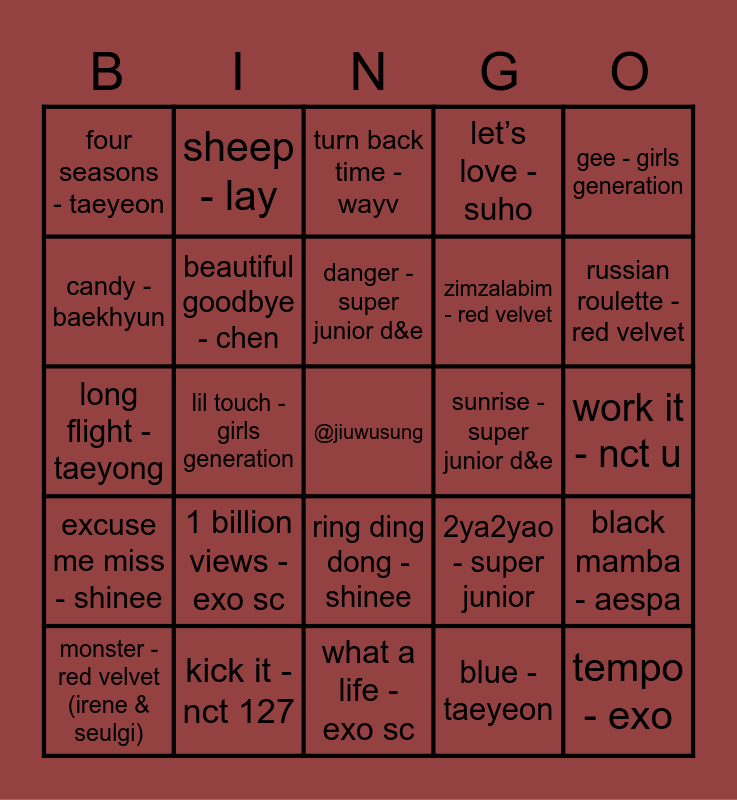 This bingo card has a free space and 48 words: monster - exo, tempo - exo, love shot - exo, what a life - exo sc, 1 billion views - exo sc, blooming day - exo cbx, sheep - lay, psycho - baekhyun, candy - baekhyun, mmmh - kai, beautiful goodbye - chen, let’s love - suho, black mamba - aespa, 2ya2yao - super junior, mamacita - super junior, super clap - super junior, danger - super junior d&e, sunrise - super junior d&e, i got a boy - girls generation, gee - girls generation, lil touch - girls generation, blue - taeyeon, four seasons - taeyeon, zimzalabim - red velvet, red flavor - red velvet, russian roulette - red velvet, monster - red velvet (irene & seulgi), naughty - red velvet (irene & seulgi), ring ding dong - shinee, excuse me miss - shinee, resonance - nct 2020, we go up - nct dream, deja vu - nct dream, boom - nct dream, kick it - nct 127, simon says - nct 127, boss - nct u, work it - nct u, 90’s love - nct u, bad alive - wayv, kick back - wayv, moonwalk - wayv, turn back time - wayv, new heroes - ten, long flight - taeyong, 2 fast - superm, super car - superm and 100 - superm.