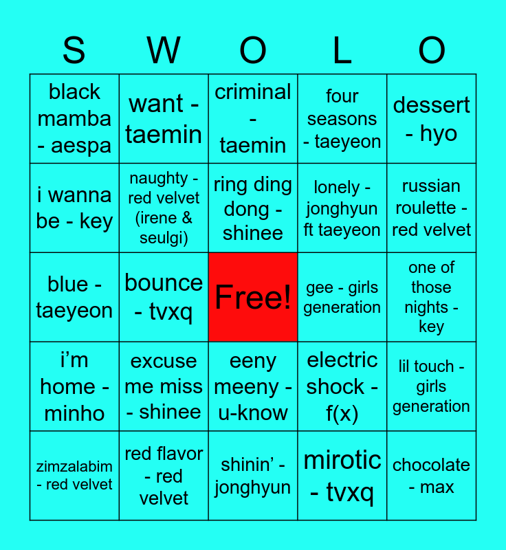 This bingo card has a free space and 27 words: electric shock - f(x), 4 walls - f(x), lonely - jonghyun ft taeyeon, shinin’ - jonghyun, i wanna be - key, criminal - taemin, want - taemin, i’m home - minho, gee - girls generation, lil touch - girls generation, blue - taeyeon, four seasons - taeyeon, zimzalabim - red velvet, red flavor - red velvet, russian roulette - red velvet, monster - red velvet (irene & seulgi), naughty - red velvet (irene & seulgi), ring ding dong - shinee, excuse me miss - shinee, black mamba - aespa, one of those nights - key, mirotic - tvxq, bounce - tvxq, chocolate - max, eeny meeny - u-know, dessert - hyo and sober - hyo.
