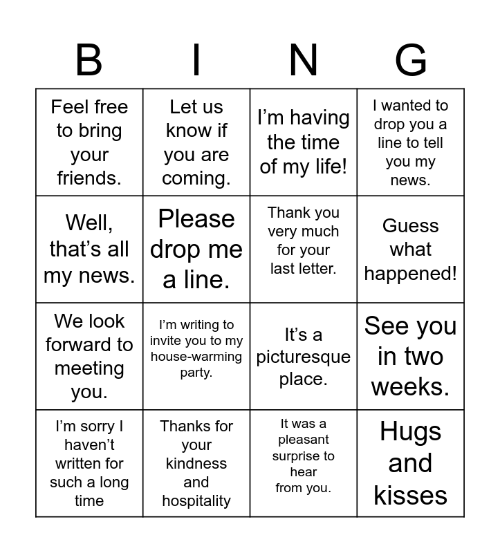 This bingo card has 16 words: Thanks for your kindness and hospitality, See you in two weeks., I’m having the time of my life!, Feel free to bring your friends., We look forward to meeting you., Let us know if you are coming., It’s a picturesque place., It was a pleasant surprise to hear from you., Well, that’s all my news., Please drop me a line., I’m sorry I haven’t written for such a long time, I wanted to drop you a line to tell you my news., I’m writing to invite you to my house-warming party., Guess what happened!, Thank you very much for your last letter. and Hugs and kisses.