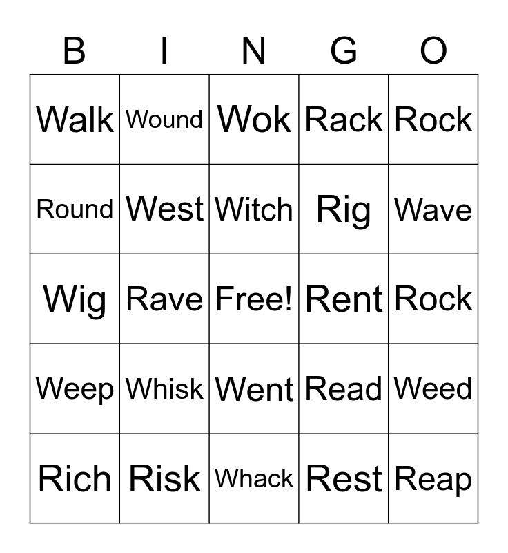 This bingo card has a free space and 24 words: Whisk, Risk, Witch, Rich, Rock, Walk, Round, Wound, Rent, Went, Rig, Wig, Read, Weed, West, Rest, Rock, Wok, Wave, Rave, Reap, Weep, Rack and Whack.