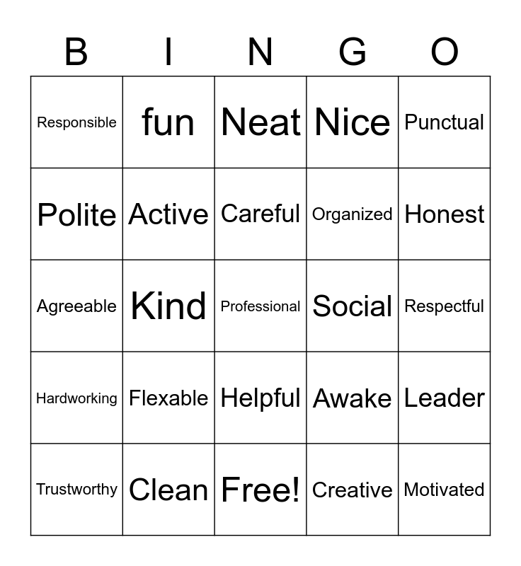 This bingo card has 25 words: Hardworking, Clean, Professional, Creative, Punctual, Responsible, fun, Neat, Social, Leader, Polite, Active, Free!, Awake, Honest, Trustworthy, Kind, Careful, Organized, Respectful, Agreeable, Flexable, Helpful, Nice and Motivated.