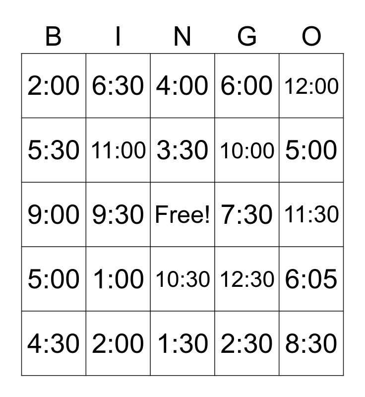 This bingo card has a free space and 24 words: 1:00, 2:00, 3:30, 4:30, 12:00, 2:00, 5:30, 6:30, 7:30, 10:30, 10:00, 9:00, 12:30, 6:05, 11:00, 2:30, 11:30, 4:00, 5:00, 9:30, 8:30, 5:00, 6:00 and 1:30.