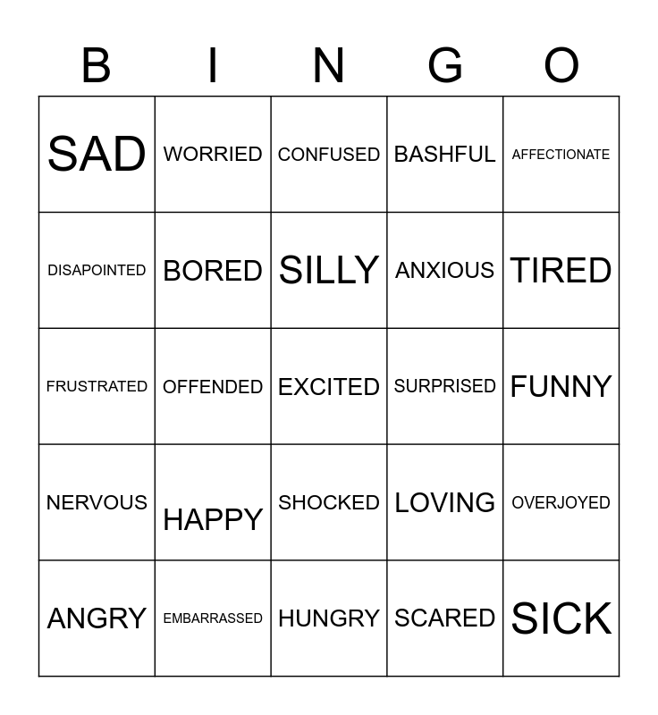 This bingo card has a free space and 24 words: HAPPY, EMBARRASSED, SILLY, ANGRY, AFFECTIONATE, SAD, DISAPOINTED, WORRIED, SURPRISED, SHOCKED, ANXIOUS, FRUSTRATED, LOVING, OVERJOYED, BORED, SCARED, FUNNY, CONFUSED, TIRED, OFFENDED, SICK, NERVOUS, BASHFUL and HUNGRY.