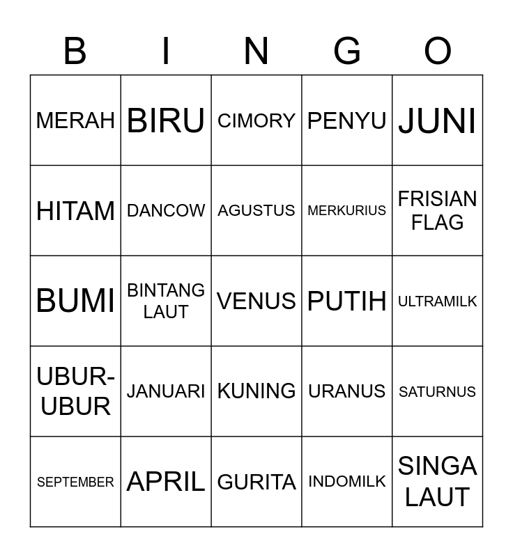 This bingo card has a free space and 24 words: JANUARI, APRIL, AGUSTUS, SEPTEMBER, JUNI, MERAH, HITAM, BIRU, PUTIH, KUNING, MERKURIUS, BUMI, URANUS, SATURNUS, DANCOW, INDOMILK, ULTRAMILK, CIMORY, FRISIAN FLAG, BINTANG LAUT, SINGA LAUT, UBUR-UBUR, PENYU and GURITA.