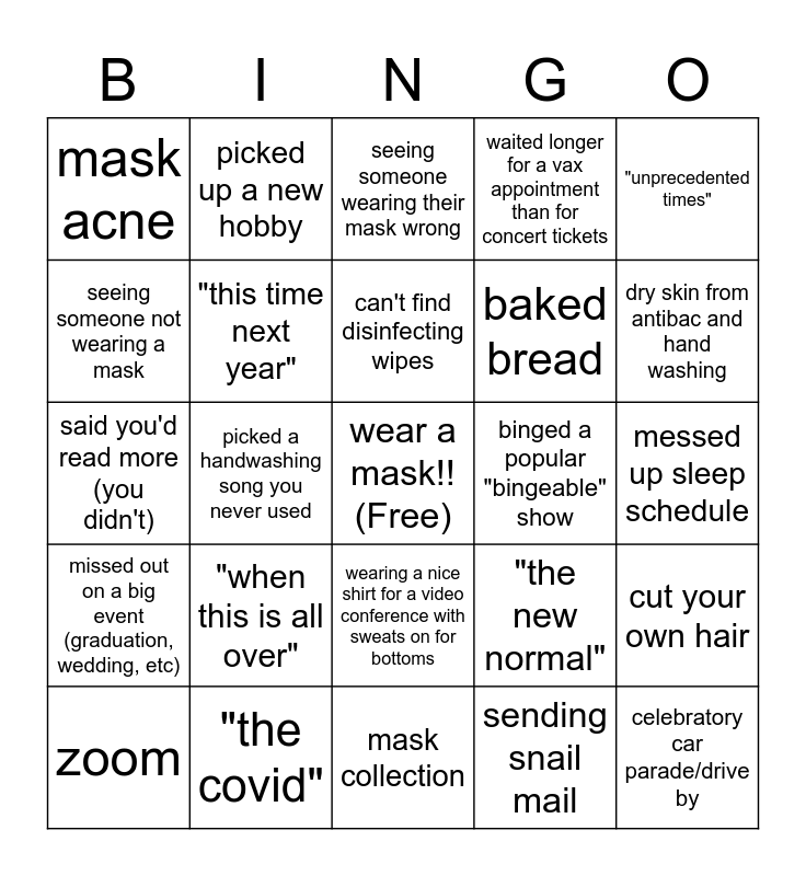 This bingo card has a free space and 24 words: "when this is all over", "the covid", can't find disinfecting wipes, zoom, "unprecedented times", mask acne, seeing someone not wearing a mask, picked up a new hobby, binged a popular "bingeable" show, wearing a nice shirt for a video conference with sweats on for bottoms, baked bread, said you'd read more (you didn't), "the new normal", cut your own hair, "this time next year", sending snail mail, messed up sleep schedule, seeing someone wearing their mask wrong, dry skin from antibac and hand washing, picked a handwashing song you never used, celebratory car parade/drive by, missed out on a big event (graduation, wedding, etc), waited longer for a vax appointment than for concert tickets and mask collection.